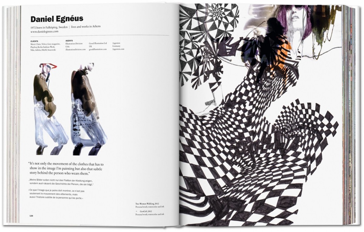 Todo vestido empieza con un dibujo, cada falda con un boceto. La ilustración es parte integral del diseño de moda, no solo como modo de expresión y punto de partida de cada creación, sino también como esbozo de patrones y estampados e incluso complemento de editoriales de revista. A menudo, los artistas ilustran las nuevas tendencias a partir de lo que ven en las pasarelas directamente. Ya iba siendo hora de que la serie Illustration Now! homenajease la ilustración de moda: en estas páginas encontraremos recientes creaciones de 90 artistas de todo el planeta, entre ellos Ruben Toledo, Aurore de La Morinerie, Bil Donovan, Tanya Ling y Jean-Philippe Delhomme. El libro recoge citas de grandes expertos del mundo de la moda: Valentino alaba el trabajo de Gladys Perint Palmer; diversas voces de los talleres de Maison Martin Margiela, Christian Dior, Louis Vuitton y H&M suman sus elogios al talento reflejado en este volumen.